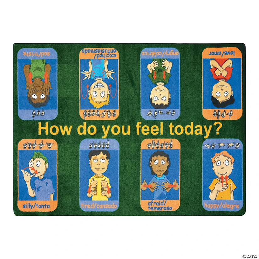 When children have difficulty expressing their feelings, they can share their emotions through the use of sign language. The Signs Of Emotions® rug provides a friendly space for kids to retreat and offers words in English and Spanish to encourage them to talk about how they are feeling. Place this multicolor carpet in your classroom to create a special place where feelings are shared. The rug reads “How do you feel today?” and includes pictures depicting the emotions: silly, tired, afraid, happy, love, angry, excited and sad. 100% Stainmaster® nylon. © Signs of Emotions