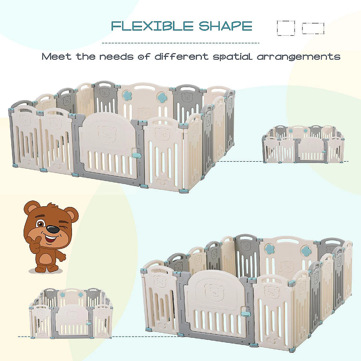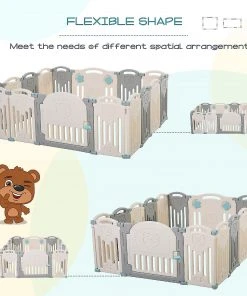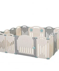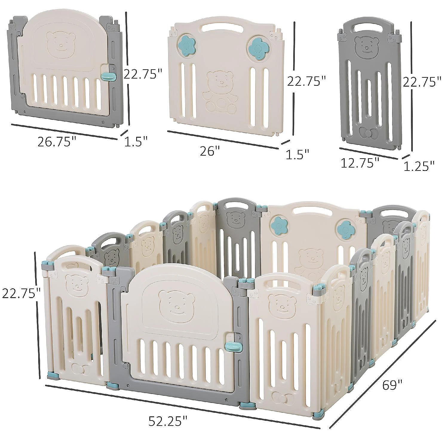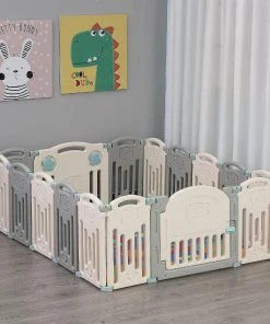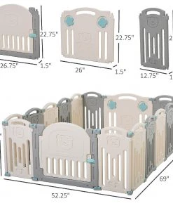Our Qaba baby playpen will be your babysitter! Your baby can stay in his own independent space to play and rest in. This baby gate is the perfect way to rest easy, knowing your child is safe and in one place in the house. The included fun games on the inside of the baby fence and cute patterns will attract your baby so that they will never be bored. Furthermore, this baby play space is flexible, and you are able to change the shape of the area at will. Solve your anxious situation and let yourself be at ease with our baby playpen!Features:- Easy to fold and set up for quick use and space-saving storage – The cute animal patterns on the playpen will attract a child’s attention – Flexible design, you can set different shape and size by with a different number of pieces – Interesting game piece includes 2 gear flowers – With strong suckers under each sturdy buckle to ensure sturdiness to deal with naughty kids – Build-in lock on the outer door keep young babies safe in the playpen and free you to leave and do your work – No-screw design and smooth surfaces avoid kids from being hurt – Handles on each piece for easy movingSpecifications:- Color: Grey, White – Material: HDPE, PP – Door Piece Size: 26.75″ W x 22.75″ H x 1.5″ T – Game Piece Size: 26″ W x 22.75″ H x 1.5″ T – Normal Piece Size: 12.75″ W x 22.75″ H x 1.25″ T – Age: 6-36 Months – Certification: ASTM F1004